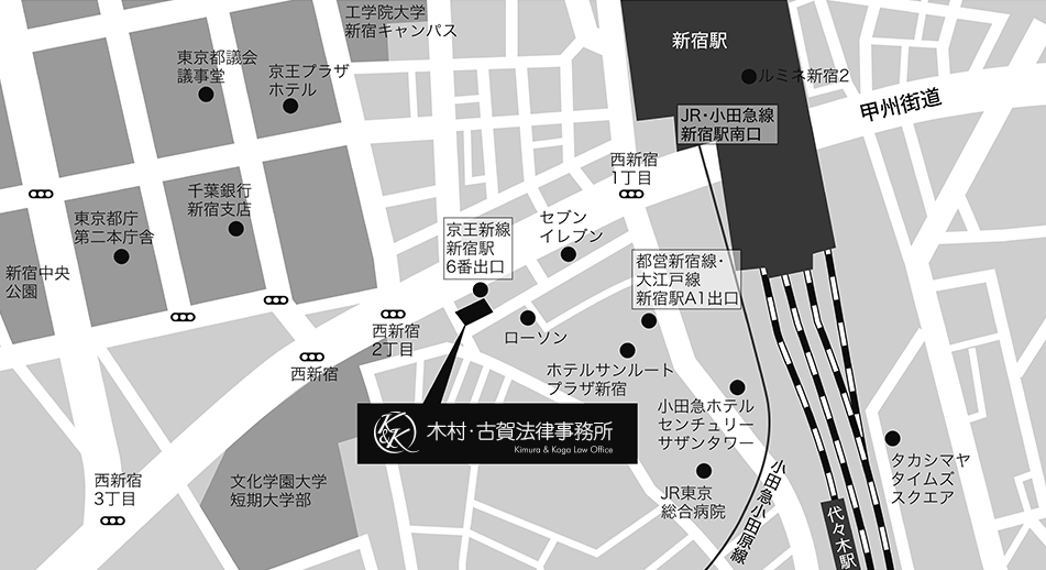 | JR・小田急線新宿駅南口 | 徒歩5分 | 京王新線新宿駅6番出口 | 徒歩1分 | 都営大江戸線/都営新宿線新宿駅A1出口 | 徒歩2分 |
