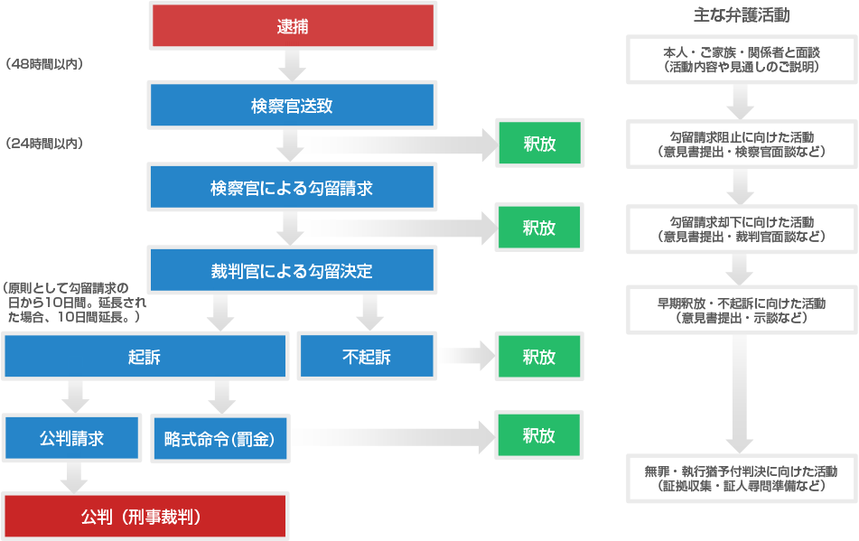この最初の72時間やその後の20日間の間に、取調べにどのように対応するか、示談が成立するかどうか、冤罪の証拠を収集できるかどうかによって、釈放・起訴の判断が左右されます。
